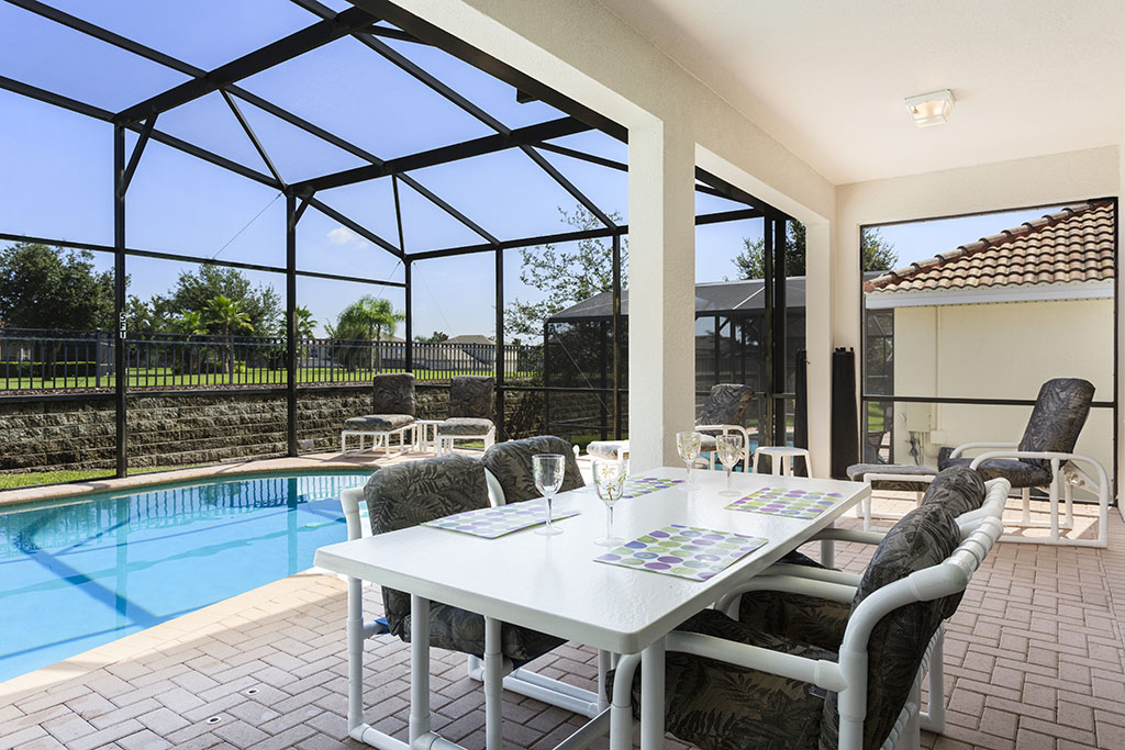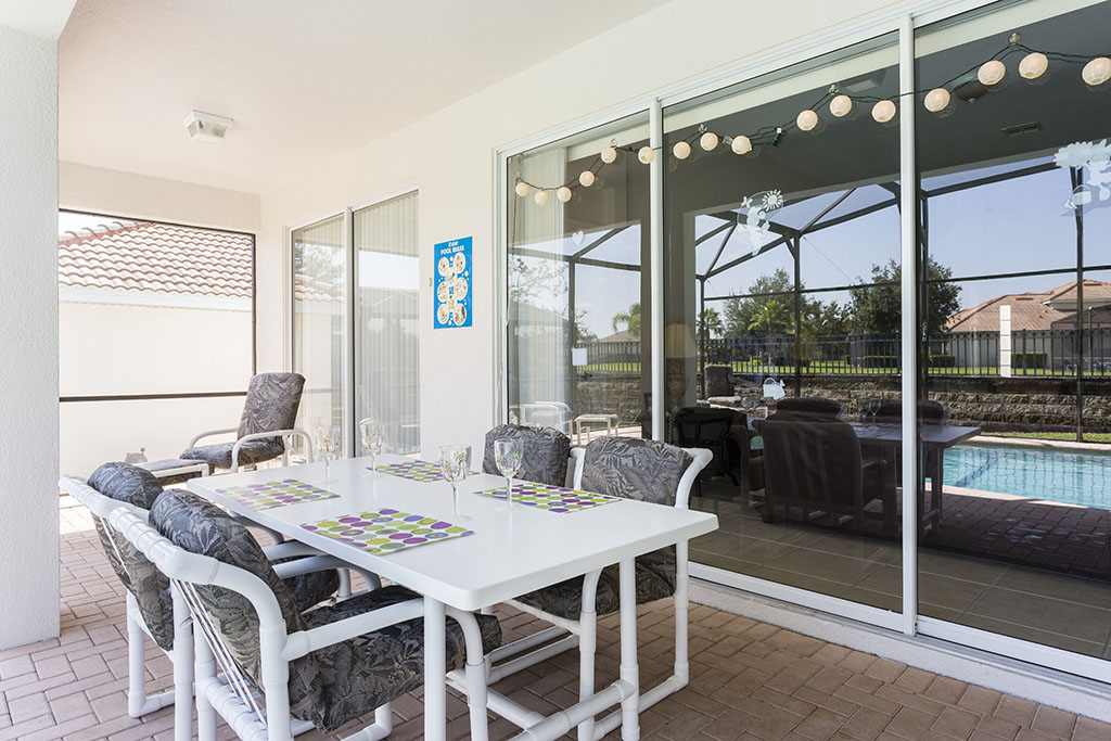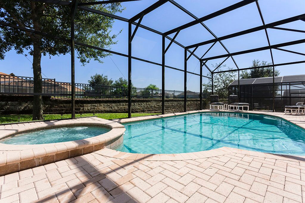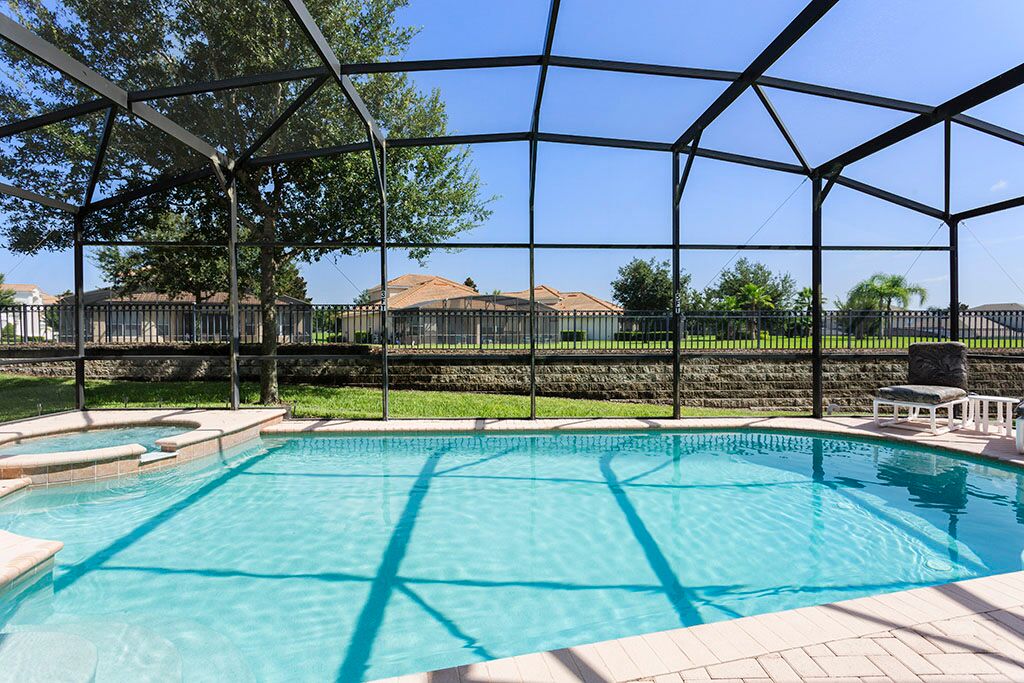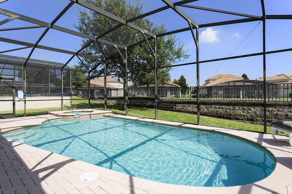 Large swimming pool (with a removable child safety fence), deck, with spa and shaded lanai. The deck has a large table ideal for outside dining, with seats and loungers to relax and enjoy the Florida sunshine.